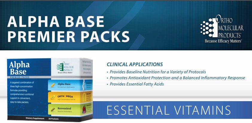 Supplement of the Month: Alpha Base® Premier Packs$58 for 30 day supply Provides Baseline Nutrition for a Variety of Protocols Promotes Antioxidant Protection and a Balanced Inflammatory Response Provides Essential Fatty Acids Each pack includes Alpha Base® Capsules without Iron, a hypoallergenic, comprehensive, high-quality blend of bioavailable vitamins and minerals. Orthomega® 820 is also included, and contains 430 of eicosapentaenoic acid (EPA), 390 mg of docosahexaenoic acid (DHA) and 50 mg of docosapentaenoic acid (DPA) omega-3 fatty acids per soft gel. Finally, each pack includes Resvoxitrol, a unique combination of phytonutrients, including the Complete Turmeric Matrix, designed to enhance antioxidant potential and inflammatory balance in the body. Suggested Use:1 packet per day or as recommended by your health care professional More Alpha Base Info